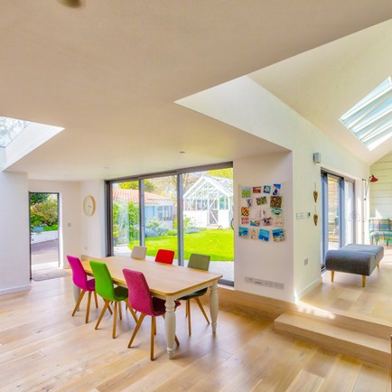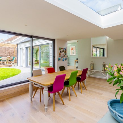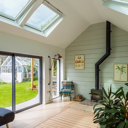 The light, airy extension complements the existing cottage with gorgeous materials such as exposed timber boarding and granite.